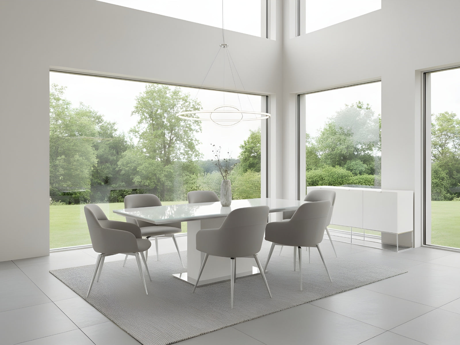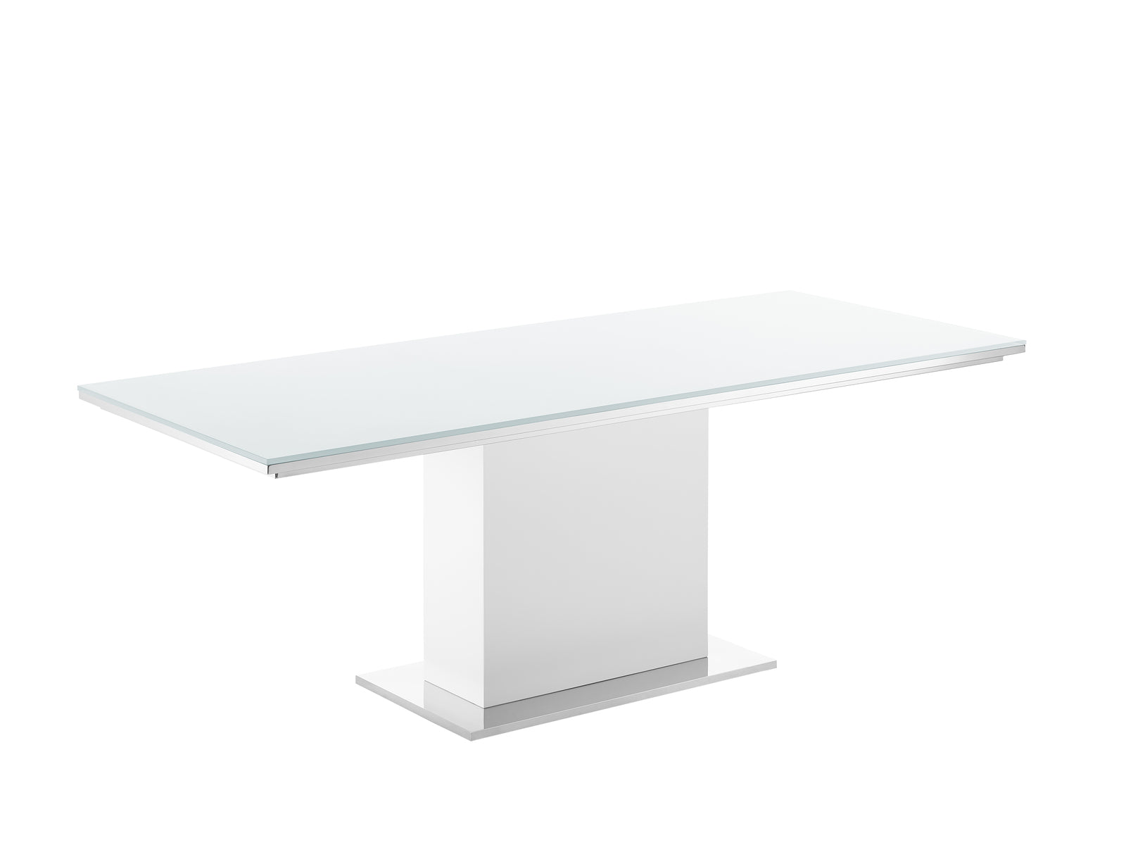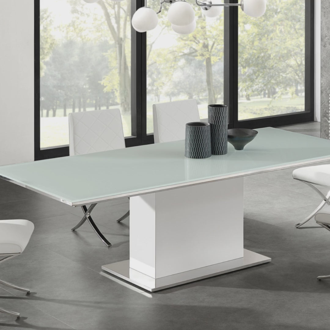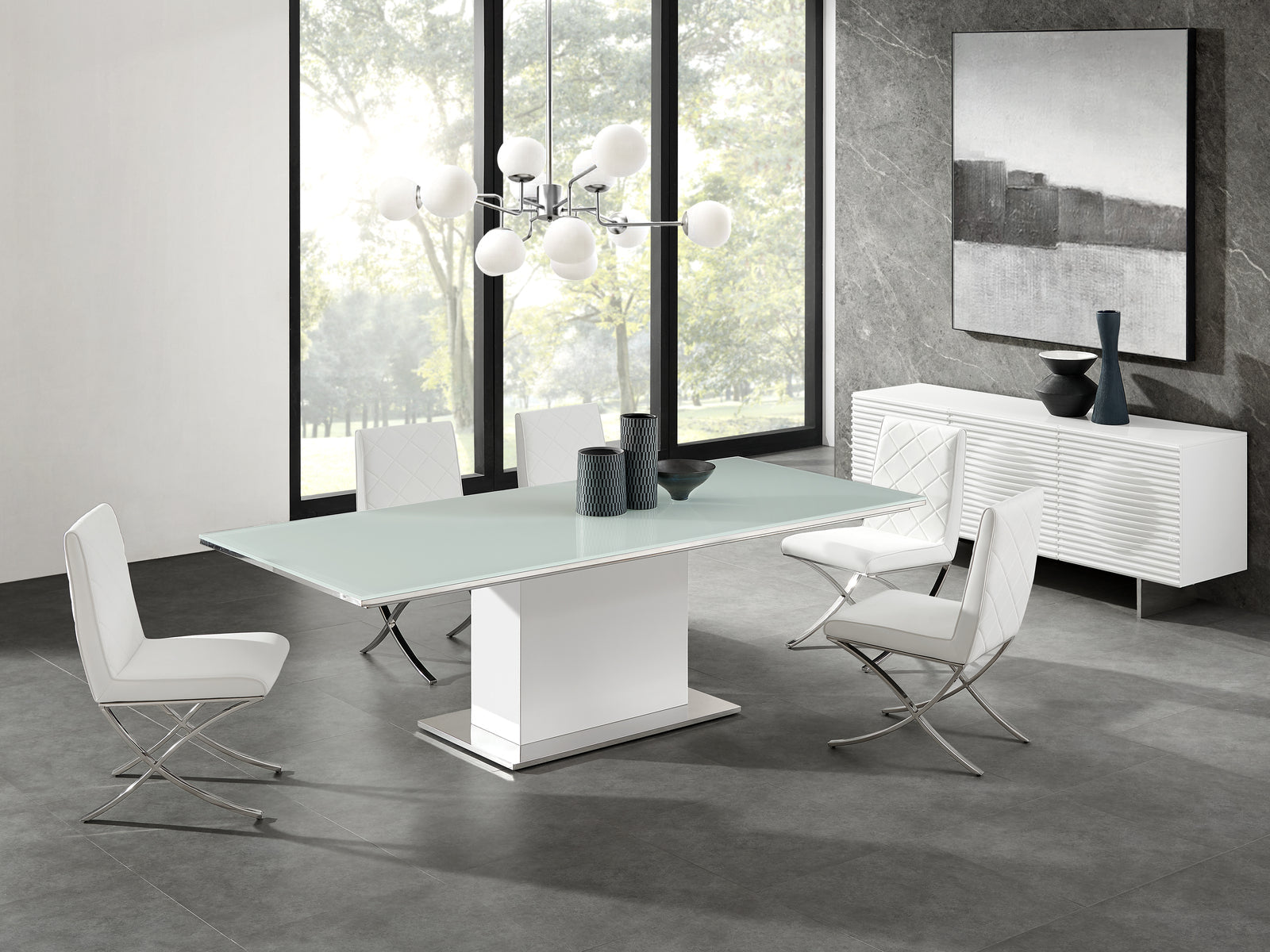 The CasaBianca Home Bianca dining table with white base and white top offers a blend of adaptable style and comfort boasting a modern design that seamlessly complements your dining room decor.