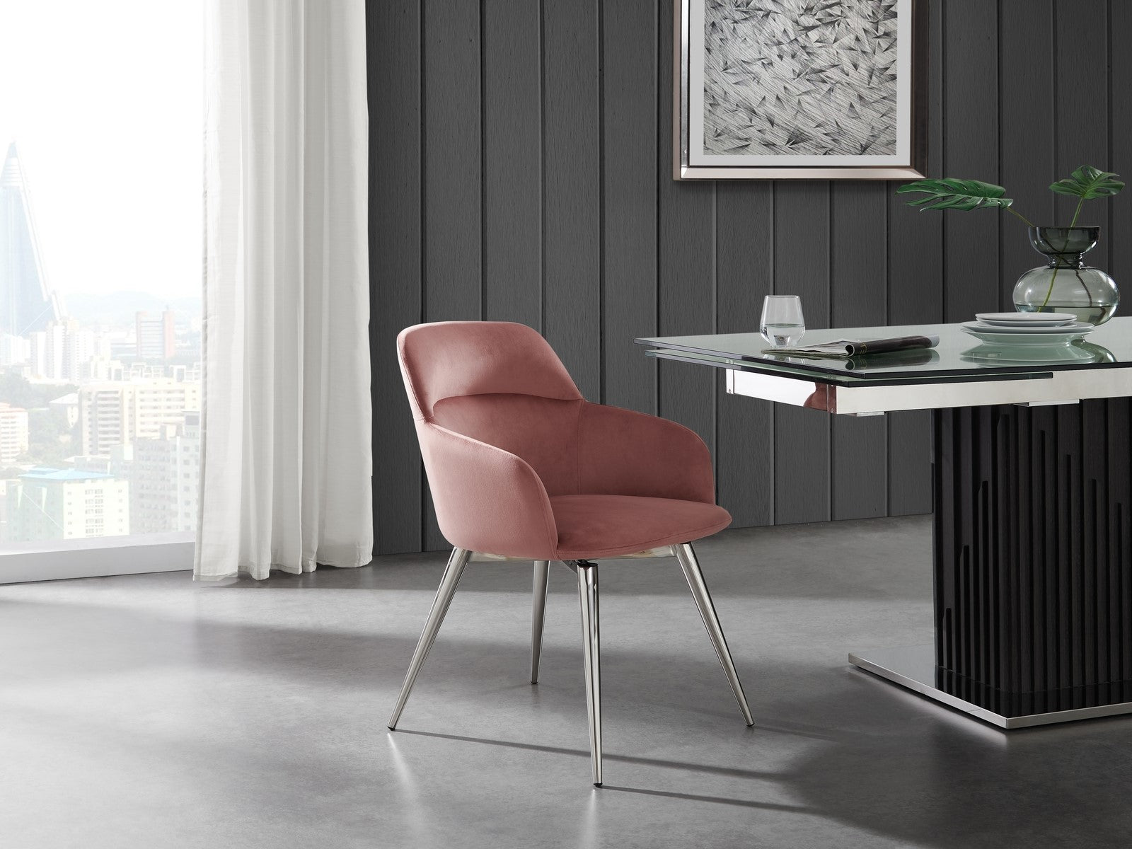 The Casabianca Home Pirouette 180 swivel dining chair in dusty pink velvet offers a blend of adaptable style and comfort boasting a modern design that seamlessly complements your dining room decor.
