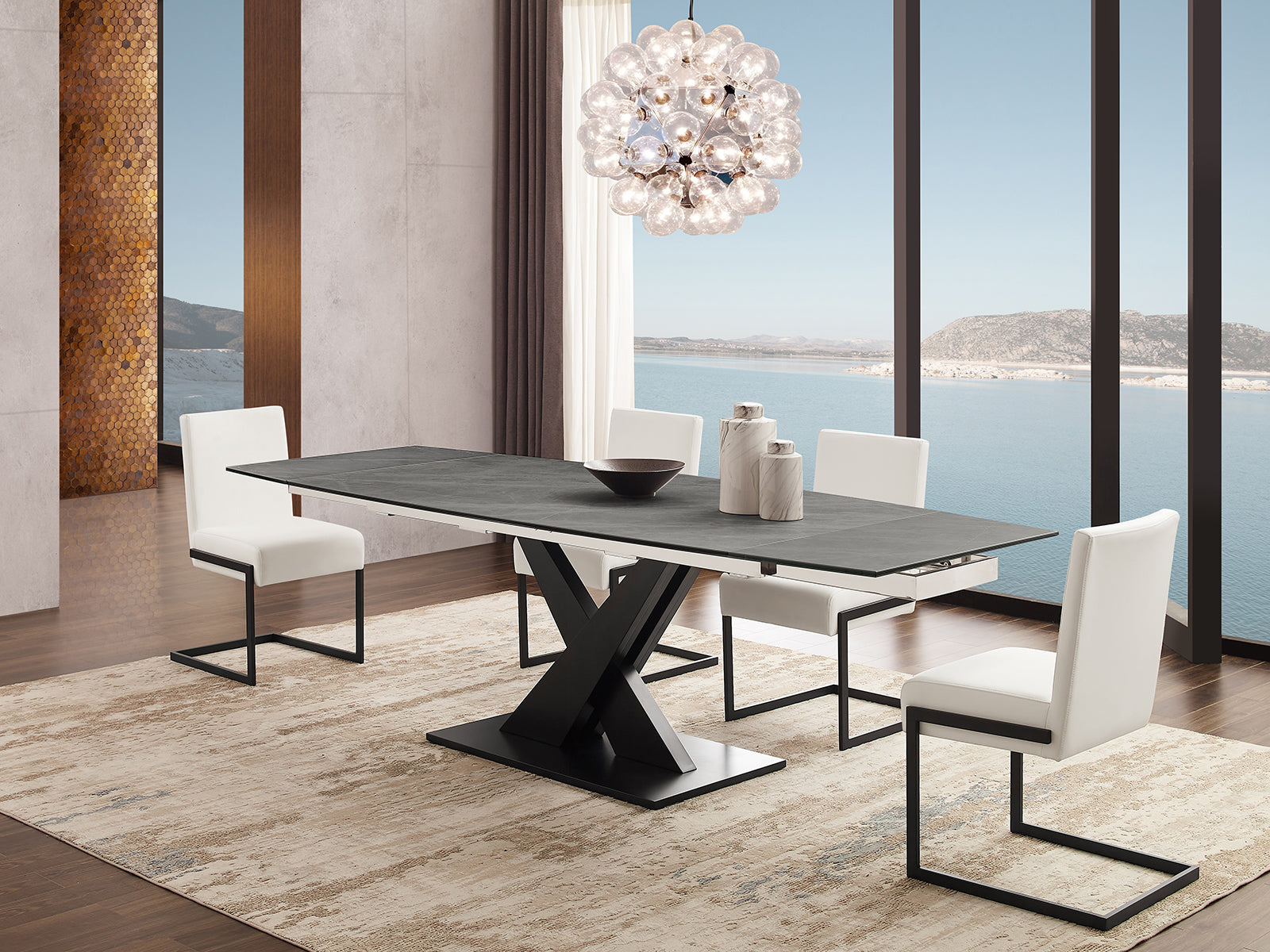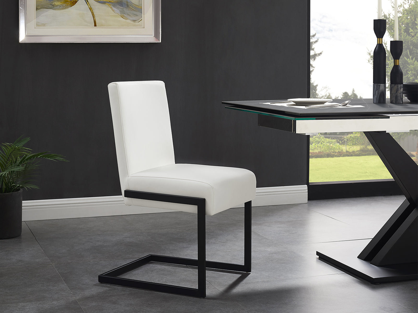 The Fontana dining chair in white pu leather with black base by Casabianca Home provides both versatile style and comfort with a ultra-modern that can easily be integrated into your current dining room decor.