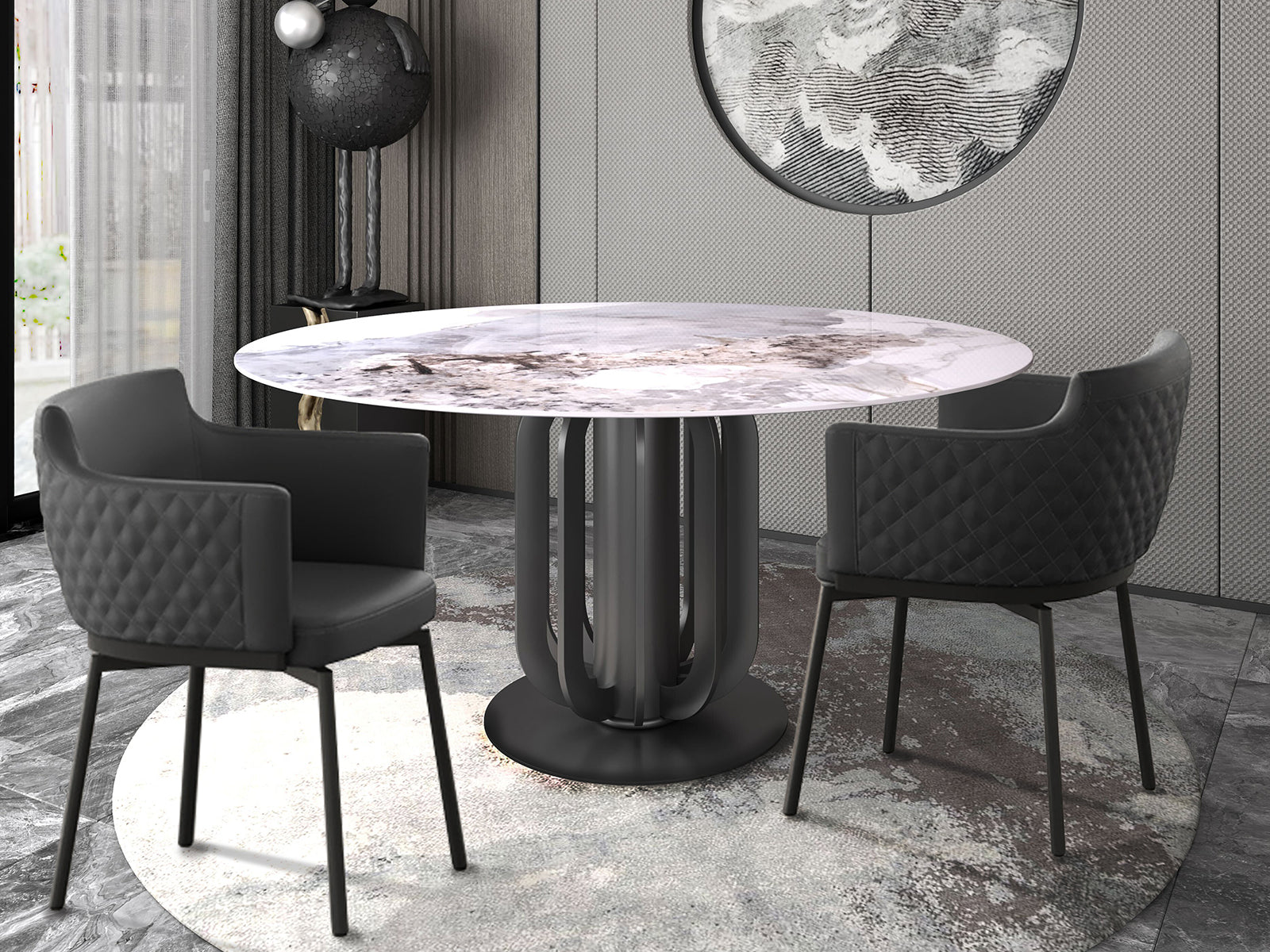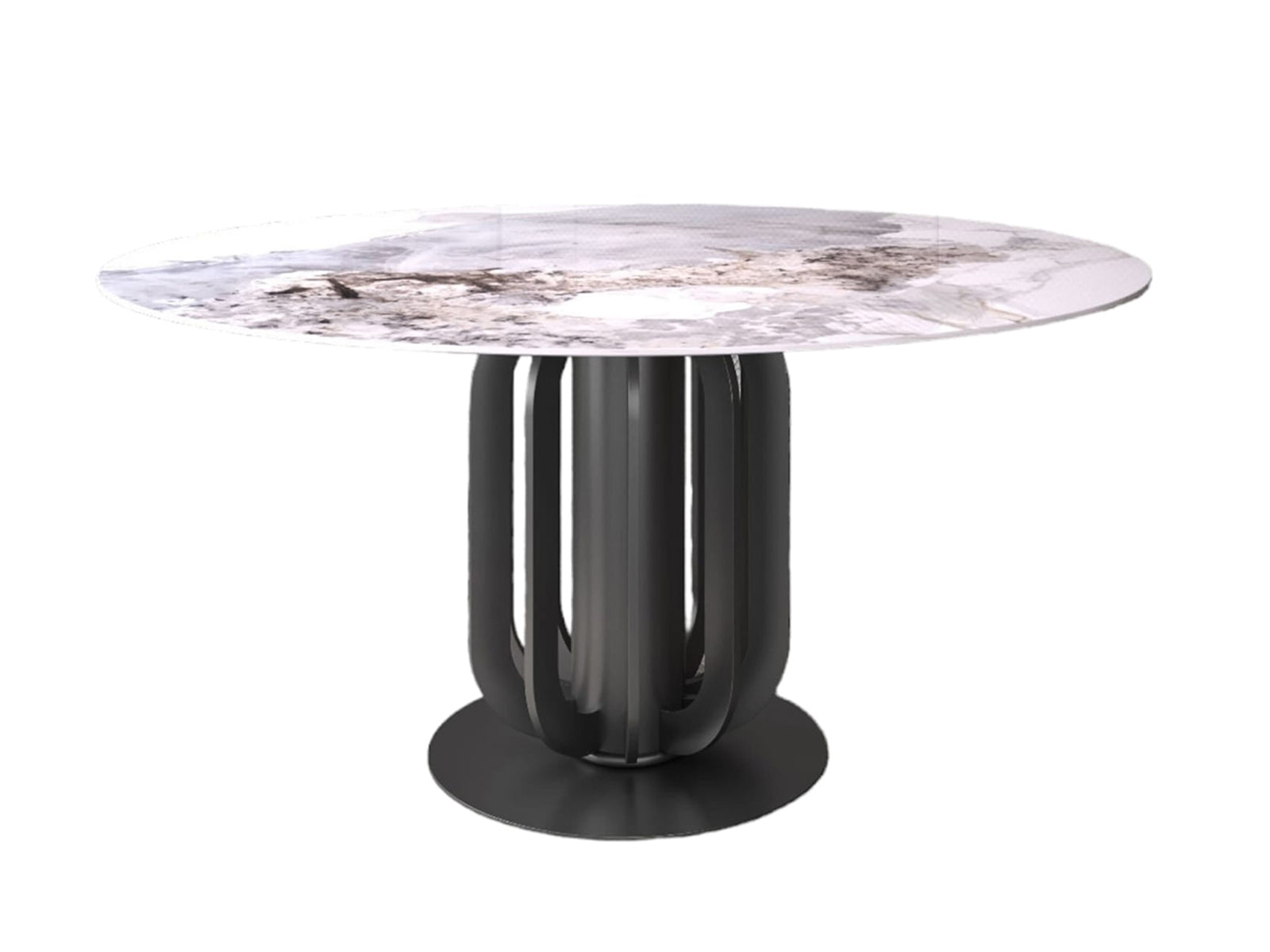 The Casabianca Home Sabrina 53 in round dining table with black base and white-gold marbled ceramic top offers a blend of adaptable style and comfort boasting a modern design that seamlessly complements your dining room decor.