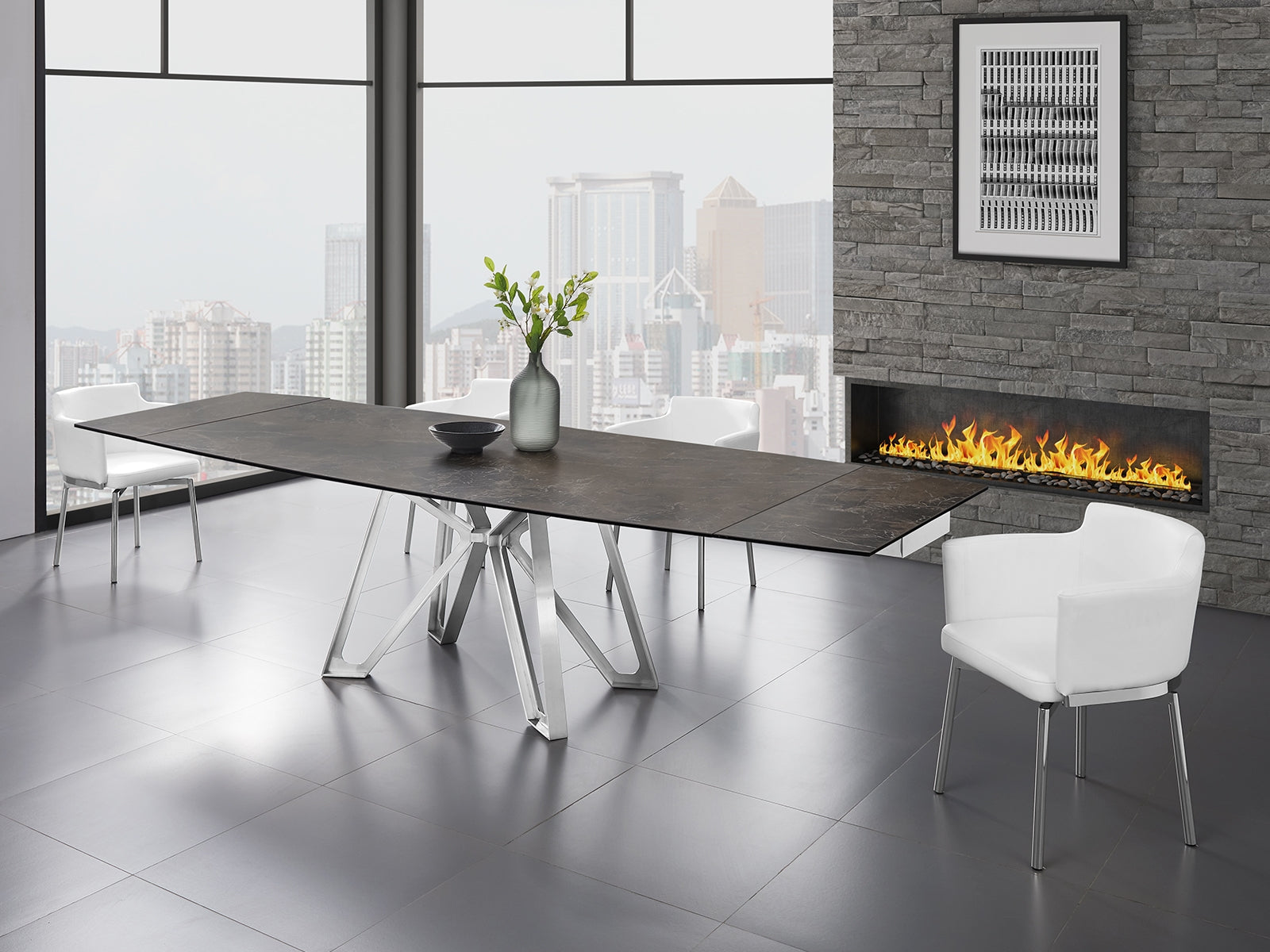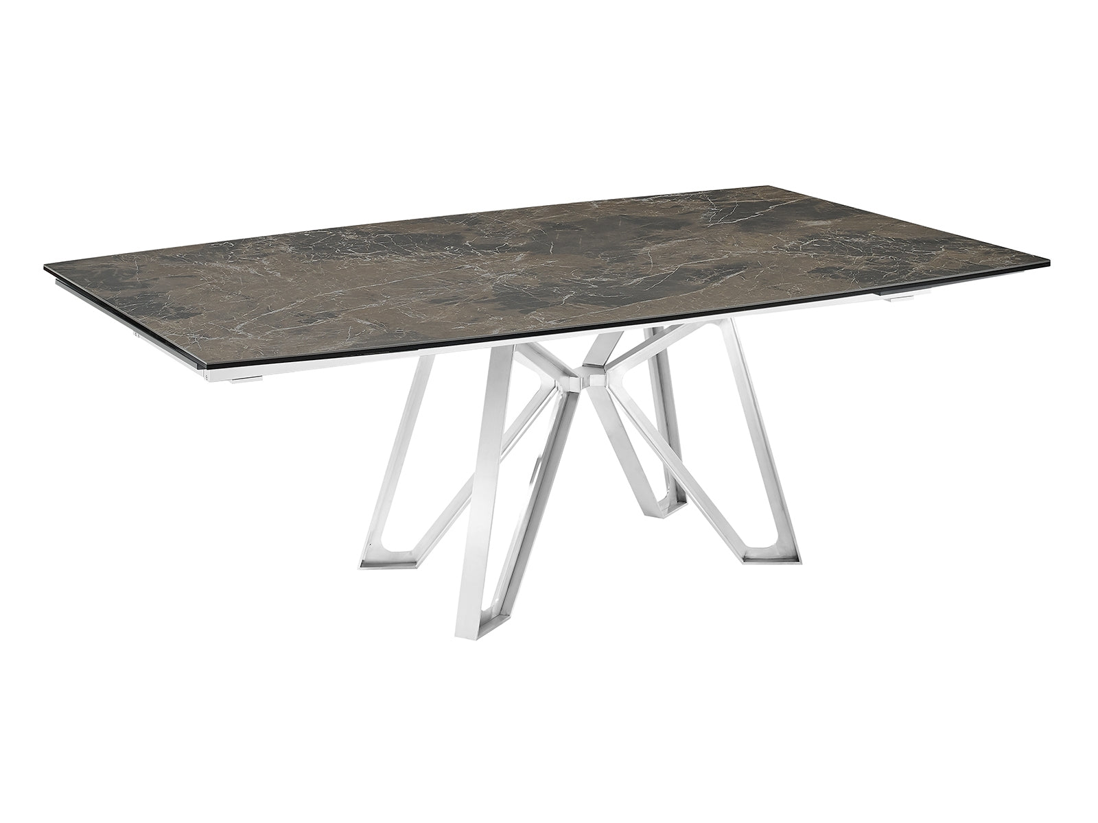 The Casabianca Home Dcota manual dining table with brushed stainless steel base and black-gold marbled porcelain top offers a blend of adaptable style and comfort boasting a modern design that seamlessly complements your dining room decor. This Dcota manual dining table extends from 71" to 103" providing ample space for 6 - 12 seats.