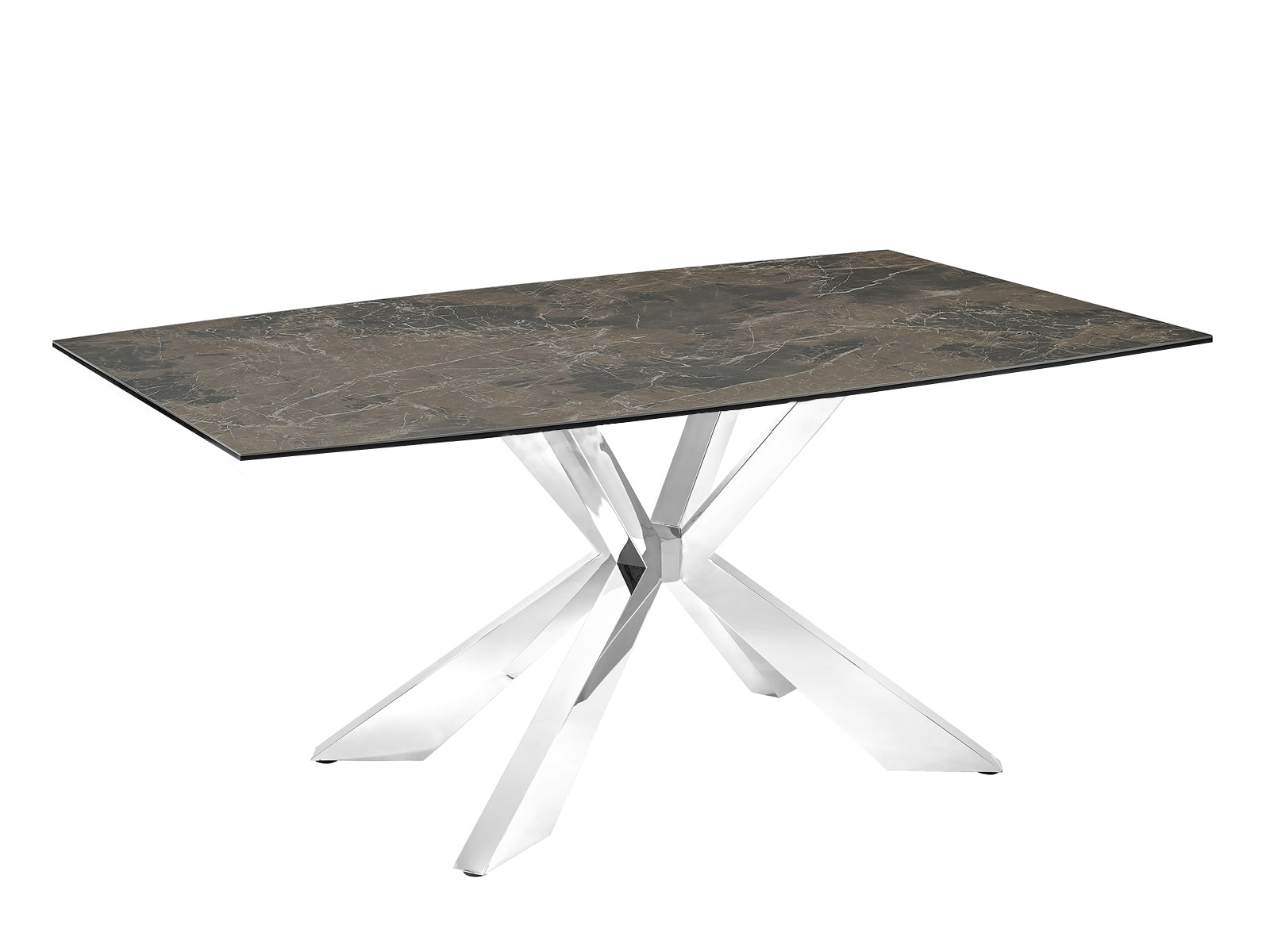 The Casabianca Home Icon dining table with stainless base and brown marbled porcelain top offers a blend of adaptable style and comfort boasting a modern design that seamlessly complements your dining room decor.