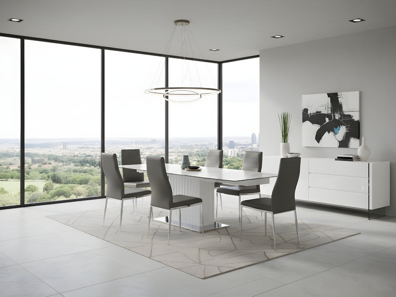 The Casabianca Home Moon manual dining table with white base and black-gold marbled porcelain top offers a blend of adaptable style and comfort boasting a modern design that seamlessly complements your dining room decor. This Moon manual dining table extends from 71" to 103" providing ample space for 6 - 12 seats.