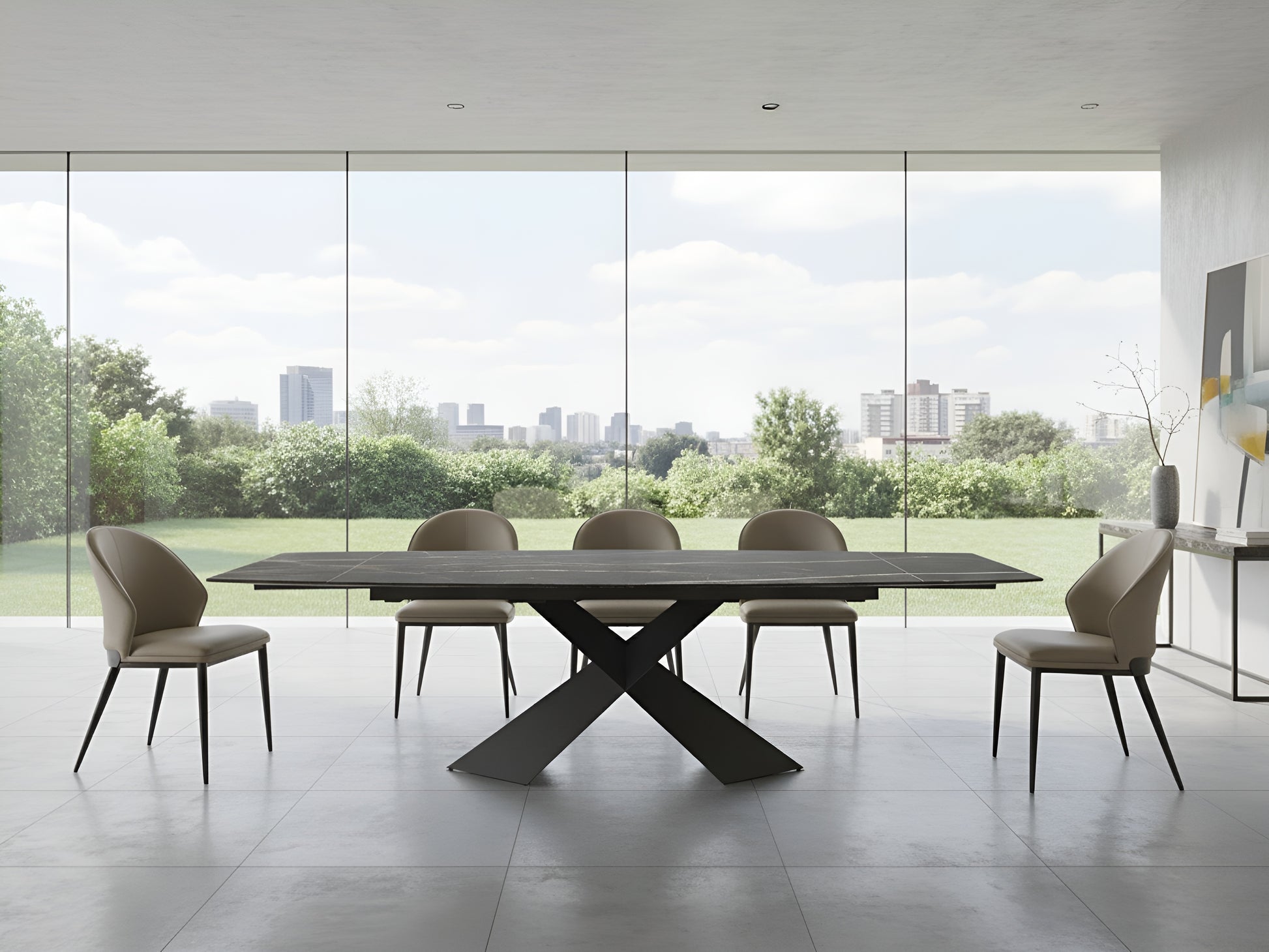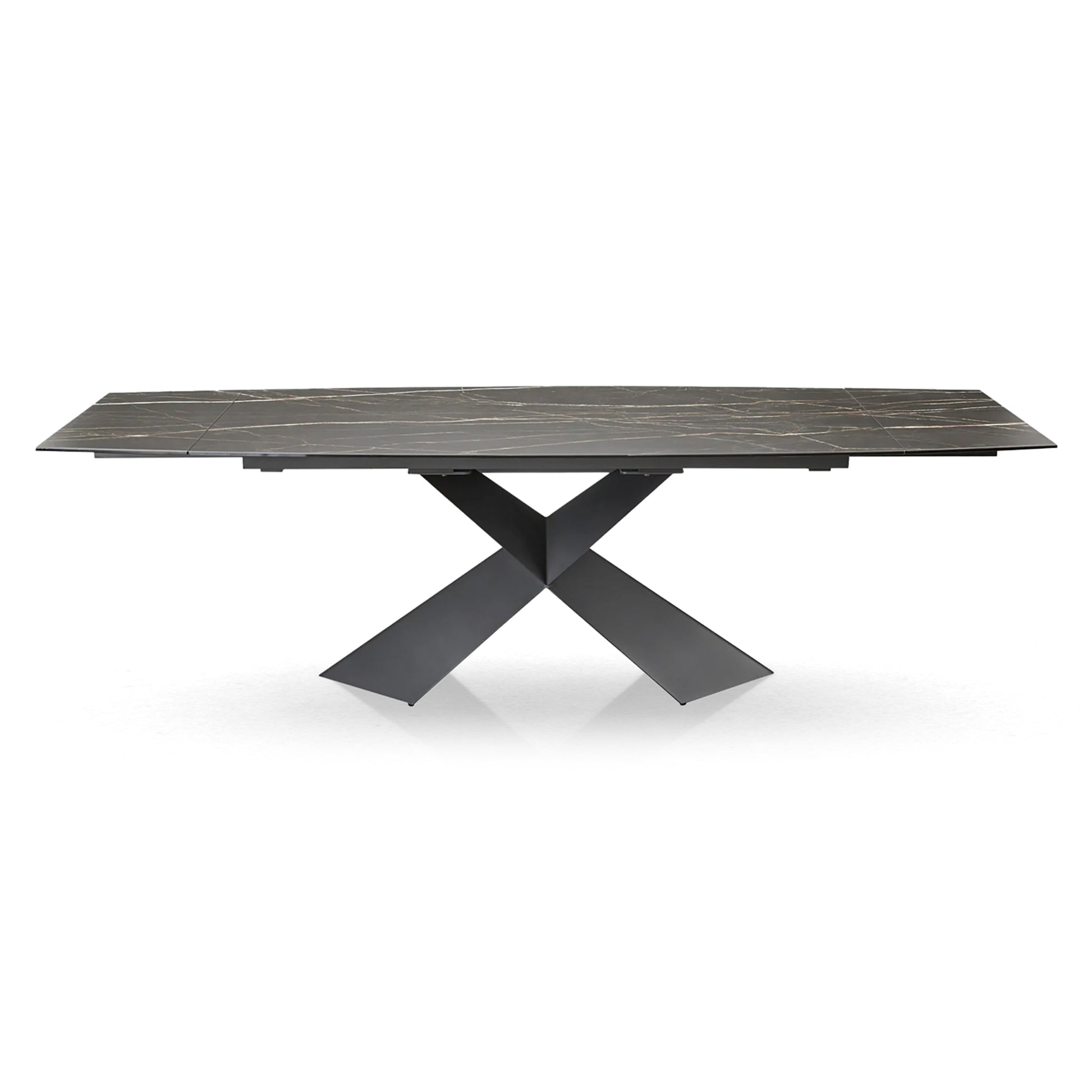 The Casabianca Home Rover extendable dining table with black base and black marbled porcelain top offers a blend of adaptable style and comfort boasting a modern design that seamlessly complements your dining room decor. This Rover extendable dining table extends from 71" to 103" providing ample space for 6 - 12 seats.
