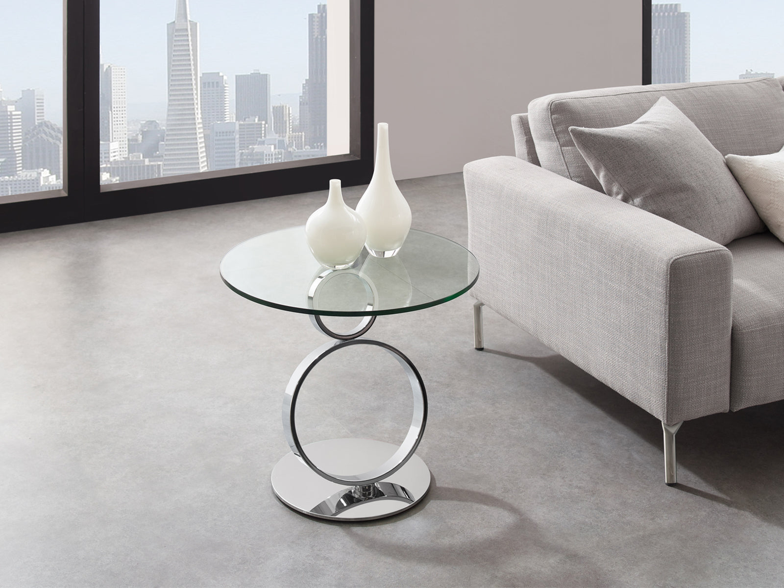 The Casabianca Home Satellite round end table in clear glass offers a blend of adaptable style and comfort boasting a modern design that seamlessly complements your home decor.