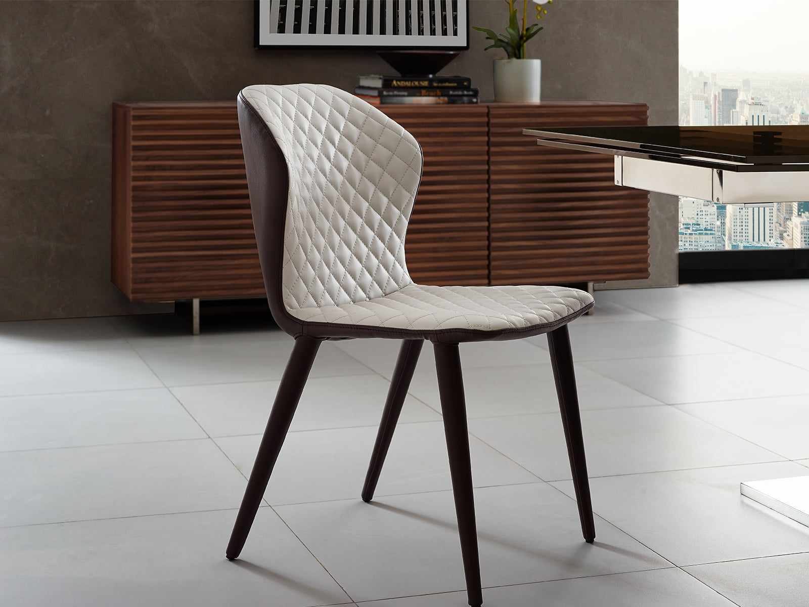 The Casabianca Home Olivia dining chair in beige pu leather offers a blend of adaptable style and comfort boasting a modern design that seamlessly complements your dining room decor.