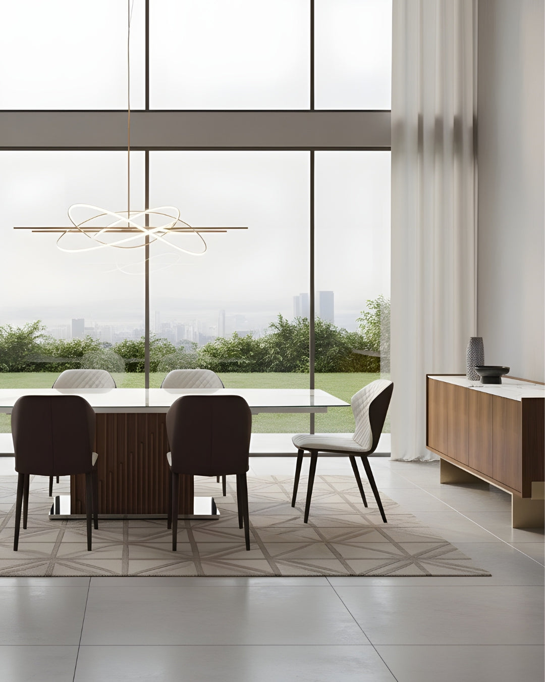 Introducing the Moon dining table —where cutting-edge innovation meets timeless elegance. Featuring a sleek walnut base and a striking white marbled porcelain top.